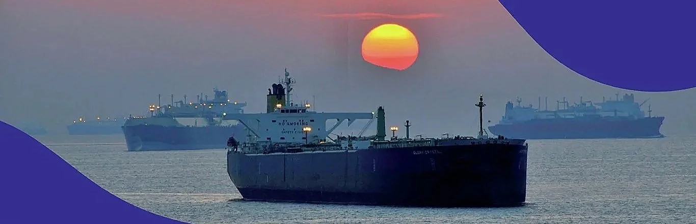 📷 Shipping including oil tankers anchored in the Gulf of Oman at sunset, waiting to travel through the Strait of Hormuz